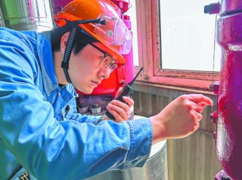 图为11月24日镇海炼化员工现场检查高温蒸汽减温减压设备运行状况。