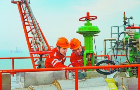 图为11月23日胜利油田中心三号平台员工认真排查设备隐患。