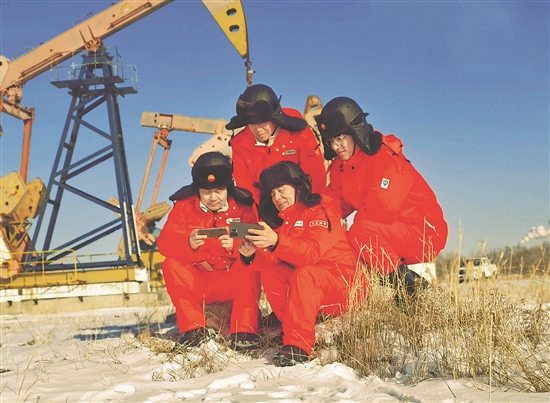 大庆油田采油三厂员工巡检结束后,利用休息时间在手机上收看两会转播。许书晨 摄