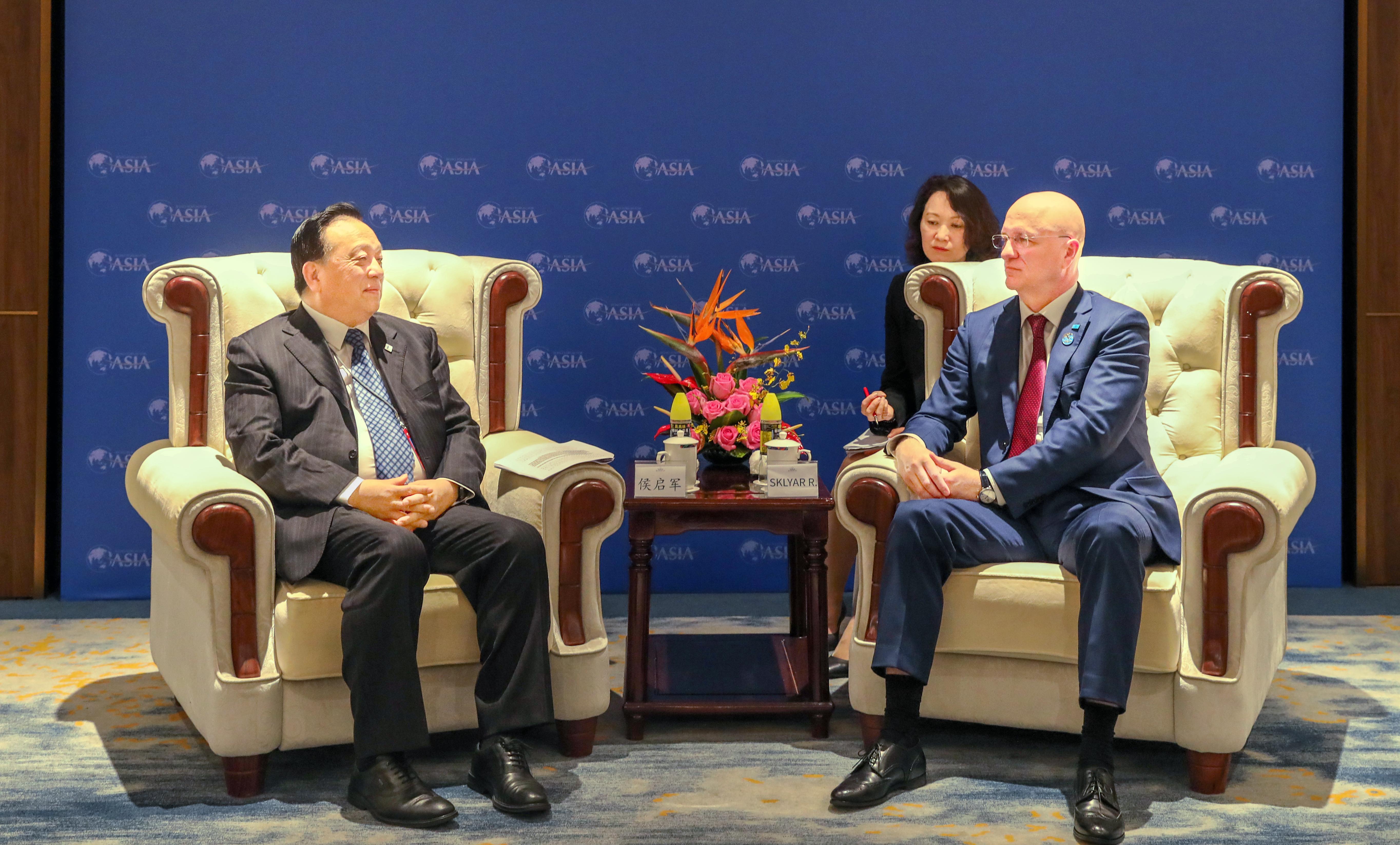 图为3月25日,侯启军在海南博鳌拜会哈萨克斯坦第一副总理斯克利亚尔。张慧慧 摄