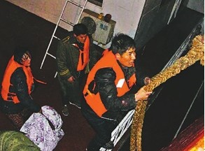时间就是生命,救险刻不容缓。"勘407"轮立即掉转船头开足马力驶向出事海域。此时阵风8级,海面一片漆黑,当"勘407"轮到达出事地点后,根本无法看到遇险船只。二副陆铖敏跨出驾驶台,打开探照灯仔细搜寻,很快发现了遇险船只。该船船身大部分已沉入水中,只能隐约看到前大桅和一小块倾斜的生活区甲板露出海面。几个身着救生衣的船员趴在甲板上大声呼救。