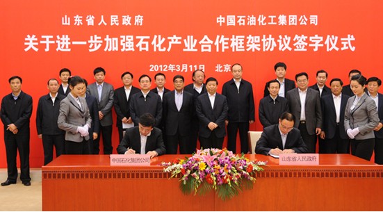 3月11日,中国石化集团公司与山东省人民政府关于进一步加强石化产业合作框架协议签字仪式在京举行。