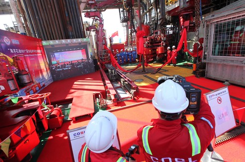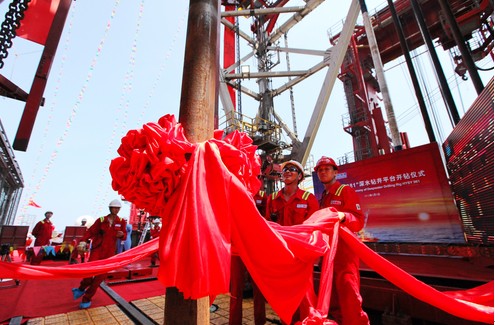 9时35分,2500公里之外,邱锐推动手中的操作杆,钻台之上,披红戴花的钻杆开始钻进。大海深处,早已铆足了劲儿的钻头终于钻入了地层之中。数千里之遥的两个地方瞬间同时成为欢乐的海洋。