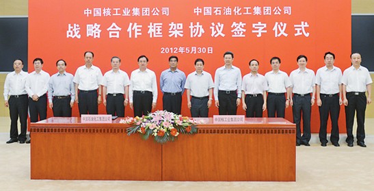 [中国石化报2012-05-31]5月30日,中国石化集团公司与中国核工业集团公司战略合作框架协议签字仪式在总部举行。双方表示将充分发挥各自优势,进一步扩大合作领域和规模,实现互利双赢、共同发展。集团公司董事长傅成玉和中国核工业集团公司董事长孙勤出席签约仪式。集团公司总经理王天普和核工业集团公司总经理钱智民代表双方在合作协议上签字。股份公司高级副总裁王志刚出席。