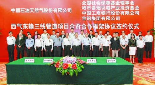 中国石油网消息(记者王晓晖张立岩)5月30日,西气东输三线管道项目合资合作框架协议在北京签署。中国石油引入全国社会保障基金理事会、城市基础设施产业投资基金和宝钢集团有限公司等作为股东,共同出资建设西三线项目;中国工商银行股份有限公司私人理财资金通过产业投资基金平台介入。这种合作开创了全民资本和民营资本共同投资于大型央企国家重点项目的新模式,标志着中国石油对全民及民营资本的开放迈出新步伐。