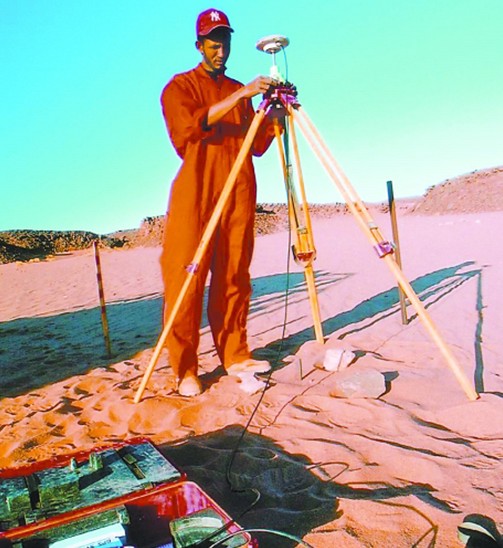 员工在撒哈拉沙漠进行放线作业。