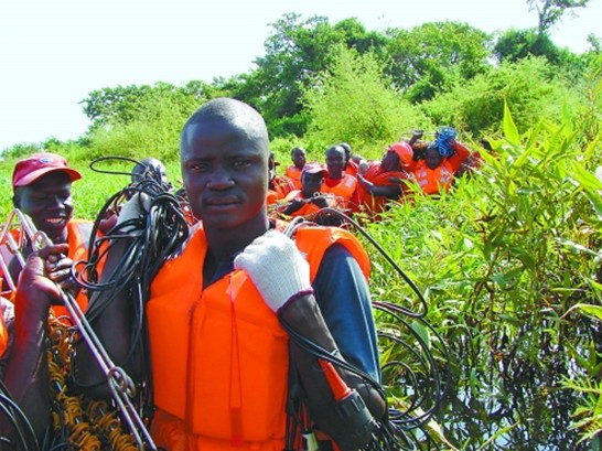 员工在非洲丛林中进行放线作业。