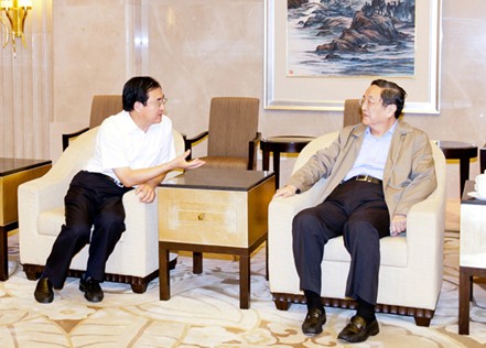 7月5日,中共中央政治局委员、上海市委书记俞正声(右)会见了正在上海企业调研的中国石化集团公司总经理王天普一行,双方就当前石化行业发展形势和进一步深化合作交换了意见。上海市委常委、副市长艾宝俊,市委常委、市委秘书长尹弘,股份公司高级副总裁章建华,集团公司总会计师刘运参加会见。记者陈鸣启摄