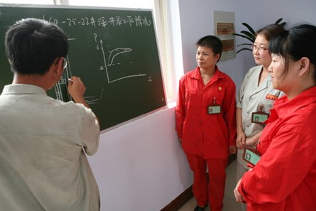 专家正在给员工讲解井泵工作原理。