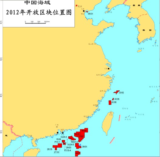 中国海域2012年第二批将推出26个区块(总面积73,754km2)可供外国公司进行合作。