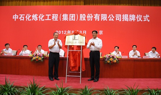 国务院国资委副主任邵宁和集团公司董事长傅成玉共同为中石化炼化工程(集团)股份有限公司揭牌,并分别讲话。揭牌仪式由集团公司总经理王天普主持,股份公司高级副总裁,中石化炼化工程(集团)股份有限公司董事长蔡希有介绍了炼化工程板块重组改制情况。集团公司副总经理李春光宣读国务院国资委关于设立中石化炼化工程(集团)股份有限公司的批复文件,集团公司领导张耀仓、章建华、徐槟、刘运和国家工商总局、国务院派驻中国石化集团公司监事会有关负责人出席揭牌仪式。