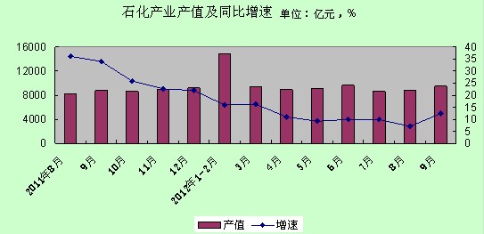 今年1-9月,石化产业实现工业总产值79014亿元,同比增长11.3%。实现工业增加值同比增长9.4%左右,其中炼油行业同比增长5.4%,化工行业同比增长11.4%。5月份以来,石化产业产值扭转了增速持续回落的态势,产值增速逐步趋稳并有所回升,其中9月份完成产值9501亿元,同比增长12.3%。