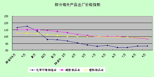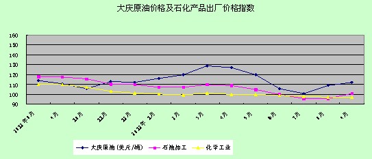 三季度以来,国家原油价格有所回升,大庆原油价格从7月份的101美元/桶回升到了112美元/桶。受此影响,石油产品价格指数和化工产品价格指数呈现止跌回稳态势,其中石油产品价格指数已逐渐回升到100以上,企业效益有所好转。