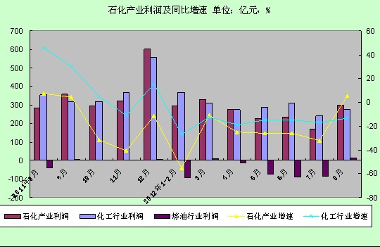 1-8月份石化产业实现利润1838亿元,同比下降28.4%。其中,炼油行业由去年同期亏损40亿元,增亏至323亿元;化工行业实现利润2066亿元,同比下降18.4%。3-8月份,石化产业利润增速逐步回升,由1-2月的同比下降55%逐渐回升到8月的同比增长6%,其中8月份,炼油行业由7月的亏损82亿元变为盈利13亿元,实现了扭亏为盈,拉动石化产业利润增速从去年9月以来首次单月实现同比增长。