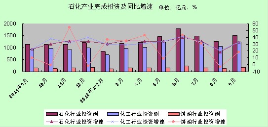 今年1-9月份,石化产业投资继续保持去年以来的稳步增长势头,完成投资10762亿元,同比增长32.9%,高于同期全社会固定资产投资增幅近13个百分点。其中,炼油行业投入1260亿元,同比增长25.1%;化工行业投入8926亿元,同比增长32.5%。1-9月份,全行业施工项目14441个,同比增长6.6%。其中,新开工项目9479个,同比增长11.5%。在具体投向上,高端制造业增幅较大,其中合成材料完成投资同比增长59.5%,专用设备同比增61.1%,显示出在整体效益下滑的情况下,行业加大了结构调整力度。