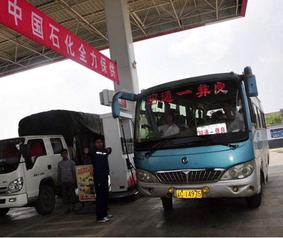 图为昭通龙泉加油站员工为赶赴灾区救援的公交集团客车加油。廖卫东李文俊摄