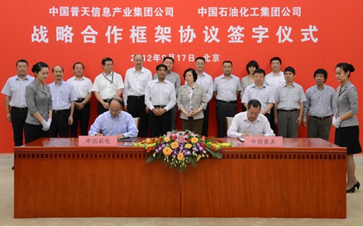 9月17日,中国石化集团公司与中国普天信息产业集团公司战略合作框架协议签字仪式在总部举行。双方表示将充分发挥各自优势,实现互利双赢,推进双方健康有效发展。集团公司董事长傅成玉和普天信息产业集团公司董事长邢炜出席签约仪式。股份公司高级副总裁戴厚良和普天信息产业集团公司副总经理徐千代表双方在合作协议上签字。