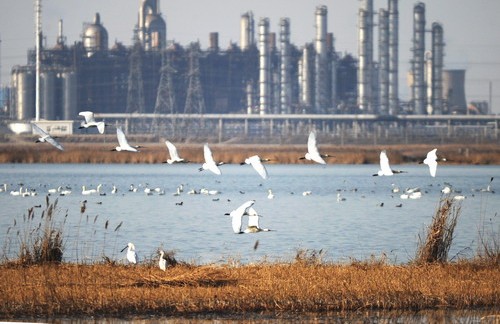 毗邻北大港湿地的石油石化企业牢固树立环保优先的理念,坚持绿色发展,与湿地的鸟儿和谐共生。吴中革摄