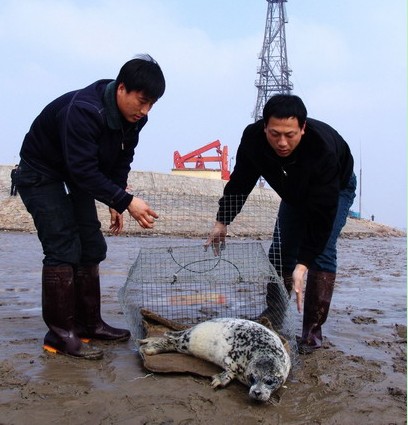 图为笔架岭作业区员工救助搁浅的斑海豹。黄振华摄