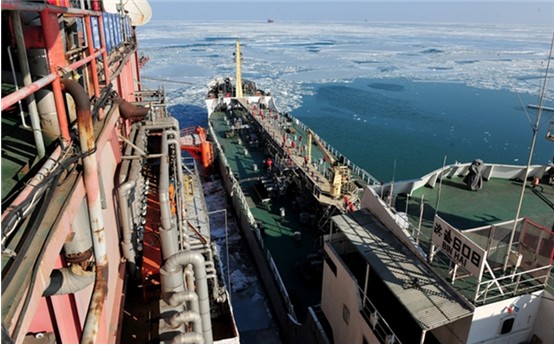锦州9-3油田原油是通过小型穿梭油轮外输转运的,每两天外输一次。每次外输前,作业区都根据海冰、潮汐等因素优化外输计划,找到最佳时机提油。油轮往返途中,油田安排两条破冰船在油轮上游持续破冰,并派专人根据破冰情况,及时指导破冰船调整破冰角度和方位,以提升破冰效果,减小海冰对油轮的威胁。