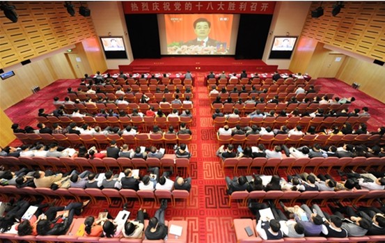 图为中国海油员工在北京朝阳门海油大厦观看十八大开幕式直播。记者张远高摄