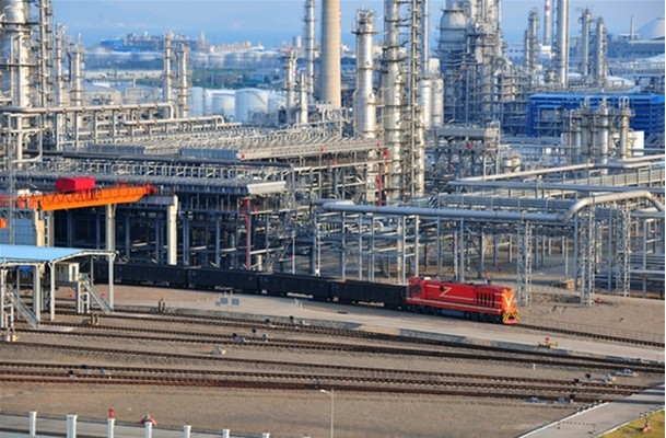 图为一辆满载炼化产品的专线火车驶出惠州炼厂。记者李佑坤摄
