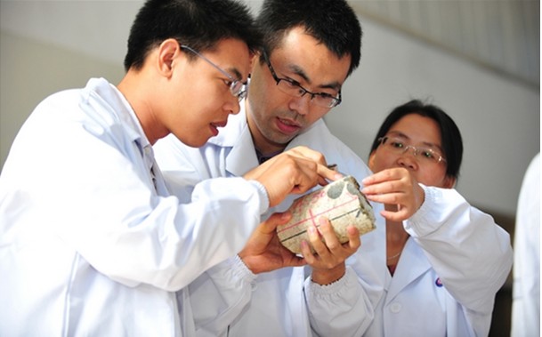 中国海油中下游板块蓬勃发展,有效发展专业服务、油品销售和石油贸易等产业,集约发展包括化肥业务的炼油化工产业和金融业务,方向明、成效显。图为研究人员正在研究渤海海域发现的首个中生界花岗岩潜山大油田——蓬莱9-1油田的岩心。记者李佑坤摄