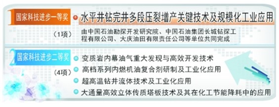 此外,中国石油还有4项成果获得国家科技进步二等奖。它们分别是由中国石油辽河油田分公司等单位完成的“变质岩内幕油气重大发现与高效开发技术”、中国石油兰州润滑油研究开发中心等单位完成的“高档系列内燃机油复合剂研制及工业化应用”、中国石油集团钻井工程技术研究院等单位完成的“超高温钻井流体技术及工业化应用”和中国石油独山子石化分公司参加完成的“大通量高效立体传质塔板技术及其在化工节能降耗中的应用”。