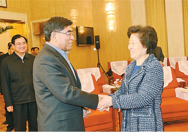 图为孙春兰与傅成玉亲切握手。记者章铮摄