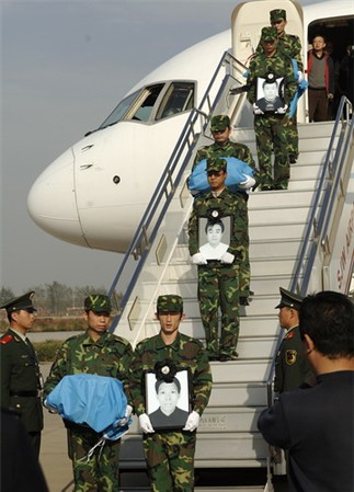 2008年10月18日,中国石油工程建设公司苏丹项目所属的华北油田工程建设公司9名人员,在苏丹西南部1/2/4区油田现场执行施工任务时,遭遇不明身份武装分子绑架,最终5人遇害、4人获救。11月5日,5名中国石油员工骨灰和4名获救人员由专机接运回国。余海摄