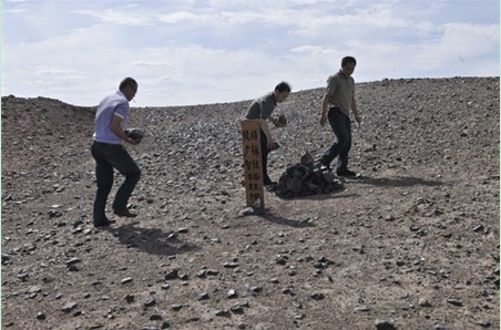 杨拯陆是著名爱国将领杨虎城将军的女儿。1955年,杨拯陆大学毕业,毅然选择到新疆搞地质勘探。1958年9月25日,杨拯陆到离队部15公里外的条湖作业点进行石油地质普查时,遭遇暴风雪强寒流袭击,不幸牺牲。和杨拯陆一同遇难的,还有队友张广智。1993年9月26日,杨拯陆牺牲35年后,三塘湖盆地塘参1井喜喷工业油流,宣告了三塘湖油田的诞生。在烈士牺牲的地点,石油人为他们立碑纪念,每当经过此地,都会按照当地习俗祭奠。余海摄