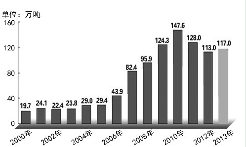 大庆油田历年复合驱产油量根据各区块产量衔接情况,预计2013年大庆油田全年复合驱产油量达117万吨。