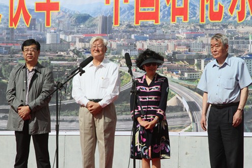 图3:委员会原会长、中华健康快车基金会副理事长余晓松(右一)、中国石化集团公司原党组成员、副总经理张家仁(左二)、青海省卫生计生委主任张进京(左一)在探访仪式现场。