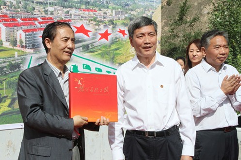 图5:中国石化思想政治工作部副主任俞明康(右)从青海省人民政府副秘书长巨伟(左)接过省政府赠予的礼物。