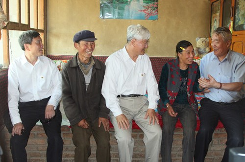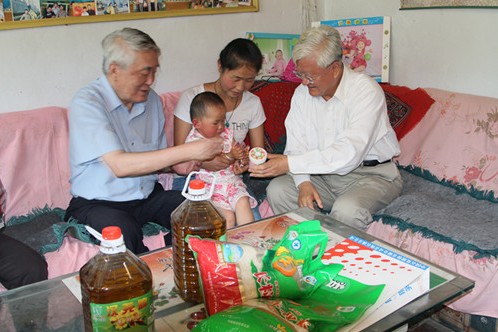 图8:中国国际贸易促进委员会原会长、中华健康快车基金会副理事长余晓松(左一),中国石化集团公司原党组成员、副总经理张家仁(右一)看望慰问救助复明的白内障患者(中)。