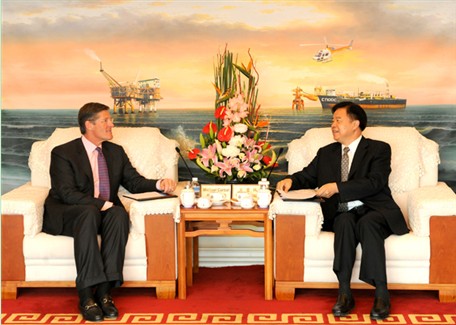 5月15日上午,总公司董事长王宜林在北京中国海油大厦会见了来访的花旗集团首席执行官高沛德一行,双方就合作事宜交换了意见。(记者刘梦涛摄影报道)
