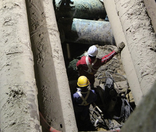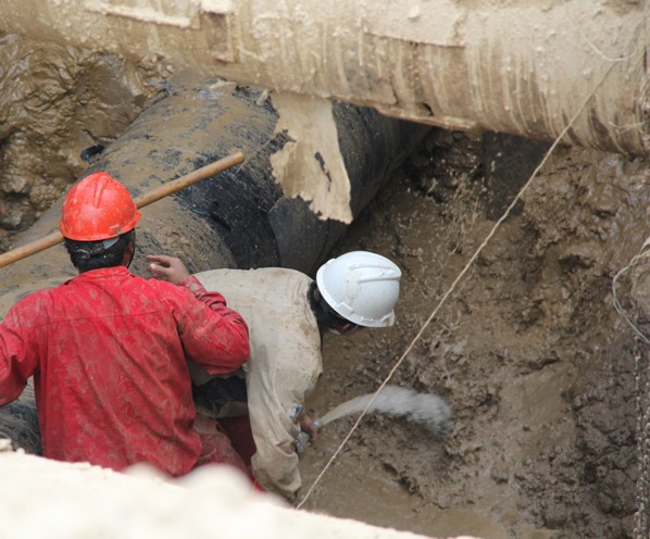 屋漏偏逢连夜雨。6月16日,距离洪峰到达施工段还有4天的关键时刻,21米深的坑底出现大面积管涌,支护钢板桩连接点不断破裂。面对管涌,中原天然气布置大口径、大扬程水泵来降低水位,并采用操作坑与水流筑坝分离的措施,保证了操作面的形成。经过96小时的连续奋战,终于克服了坑底大流量管涌、支撑下沉开裂、坑底作业面难以形成等困难。