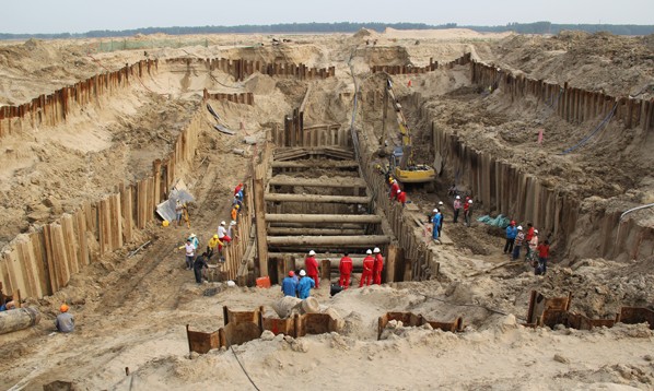 2013年5月12日,黄河主河槽管道已经拖入管洞,需要开挖基坑对2段管道进行焊接。基坑设计深度21米,南北轴线长72米,东西宽42米,是国内流砂地质条件下最大深度、最大管径的天然气管道基坑连头工程。