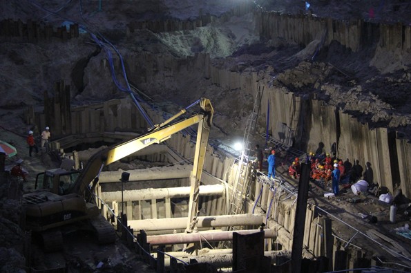 基坑深处,层层支撑下,施工人员正在清理管涌破坏后的焊接作业面,抓紧时间抢建新的操作坑。高孟林摄