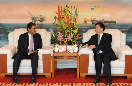 7月4日上午,总公司董事长王宜林在北京中国海油大厦会见了来访的卡塔尔天然气公司首席执行官卡利德·阿勒萨尼一行,双方就合作事宜交换了意见。(记者刘梦涛 摄影报道)