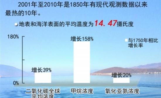 报告指出,这10年间,南北半球、地表及海洋表面的温度都高于以往,地表和海洋表面的平均温度为14.47摄氏度,比1961年至1990年间的平均温度高了0.47摄氏度,也比1991年至2000年间的平均温度高了0.21摄氏度。在本世纪的前10年里,大气中温室气体浓度不断攀升。二氧化碳的全球平均浓度与1750年相比增长了39%;此外,甲烷的浓度增长了158%,氧化亚氮的浓度增长了20%。