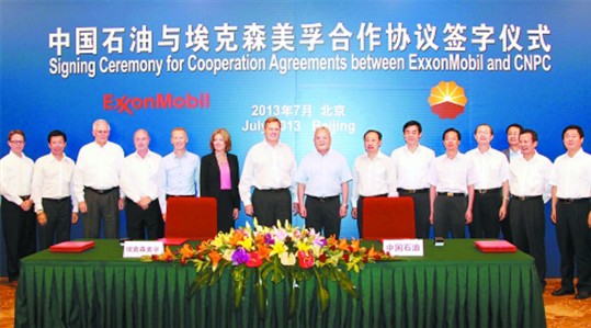 图为中国石油与埃克森美孚合作协议签字仪式现场。