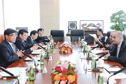 8月12日,集团公司董事长傅成玉、股份公司总裁李春光在总部会见了科威特石油公司副董事长兼首席执行官尼萨尔·阿德萨尼一行,双方进行了亲切友好的交谈。傅成玉表示,将继续深化与科威特在原油贸易、工程服务、炼化一体化等领域的合作,通过优势互补实现双赢。本报记者章铮摄