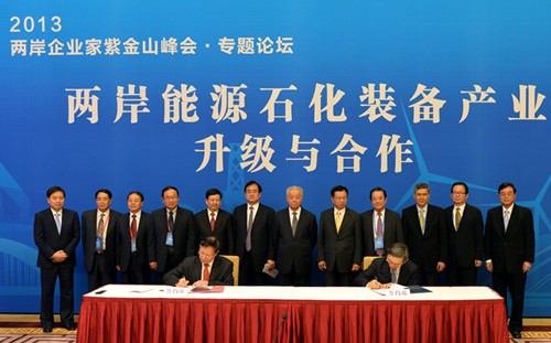 11月5日下午,“2013海峡两岸紫金山峰会”在南京闭幕,中国石化集团公司副董事长、总经理王天普出席峰会并在“两岸能源石化装备升级与合作”做专题发言。会后,王天普出席了两岸能源石化装备升级与合作推进小组能源合作谅解备忘录、加快推进漳州古雷石化炼化一体化项目框架协议与漳州古雷石化炼化一体化项目推动备忘录签字仪式。