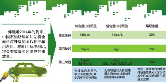 按照国家新的汽油和柴油质量标准要求,中国石油本着“奉献能源、创造和谐”的宗旨,将油品质量升级作为重点工程项目全力推进,通过供应更加清洁油品助力节能减排。据专家分析,新型国IV汽油与国III汽油相比,减少近70%的二氧化硫排放。为加快油品升级步伐,中国石油所属炼厂在2013年年底前完成国IV汽油质量升级,部分企业还提前启动国V汽油升级。从含铅汽油到国I、国II、国III、国IV,中国石油仅用10年走完欧美30年升级路。