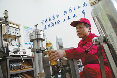 田明,47岁,江苏油田井下作业处高级技师,参加工作近30年来,完成技术创新成果90多项,在国家级刊物发表论文28篇,获国家专利22项,为企业创造了上亿元的经济效益。图为田明在劳模工作室利用自主研制的MFE测试器对原油高压样品进行转样试验。