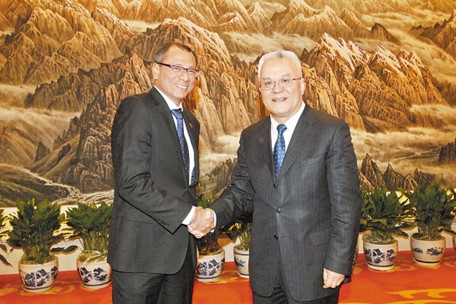 图为中国石油集团董事长周吉平会见厄瓜多尔副总统格拉斯。此前,中国石油集团副总经理、股份公司总裁汪东进与格拉斯一行就扩大上游领域合作等重要问题,进行了充分协商。