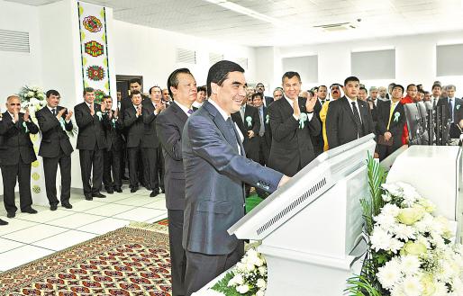 土库曼斯坦总统别尔德穆哈梅多夫在中控室指挥屏上按下启动键,为第二天然气处理厂竣工剪彩。