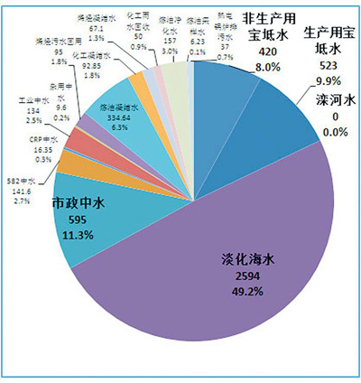 图中,淡化海水占总用水量的40%,加上市政中水、自产再生回用水,这三部分占了全部工业用水的80%,剩余的20%是地表水,也就是新鲜水,包括宝坻水(宝坻区地下水)和滦河水,这部分也正在渐渐被前三部分所替代。