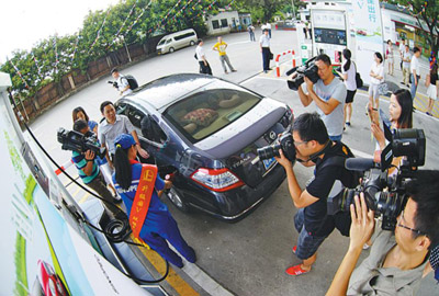 媒体记者争相采访和拍摄车主加注国5汽油的场景。